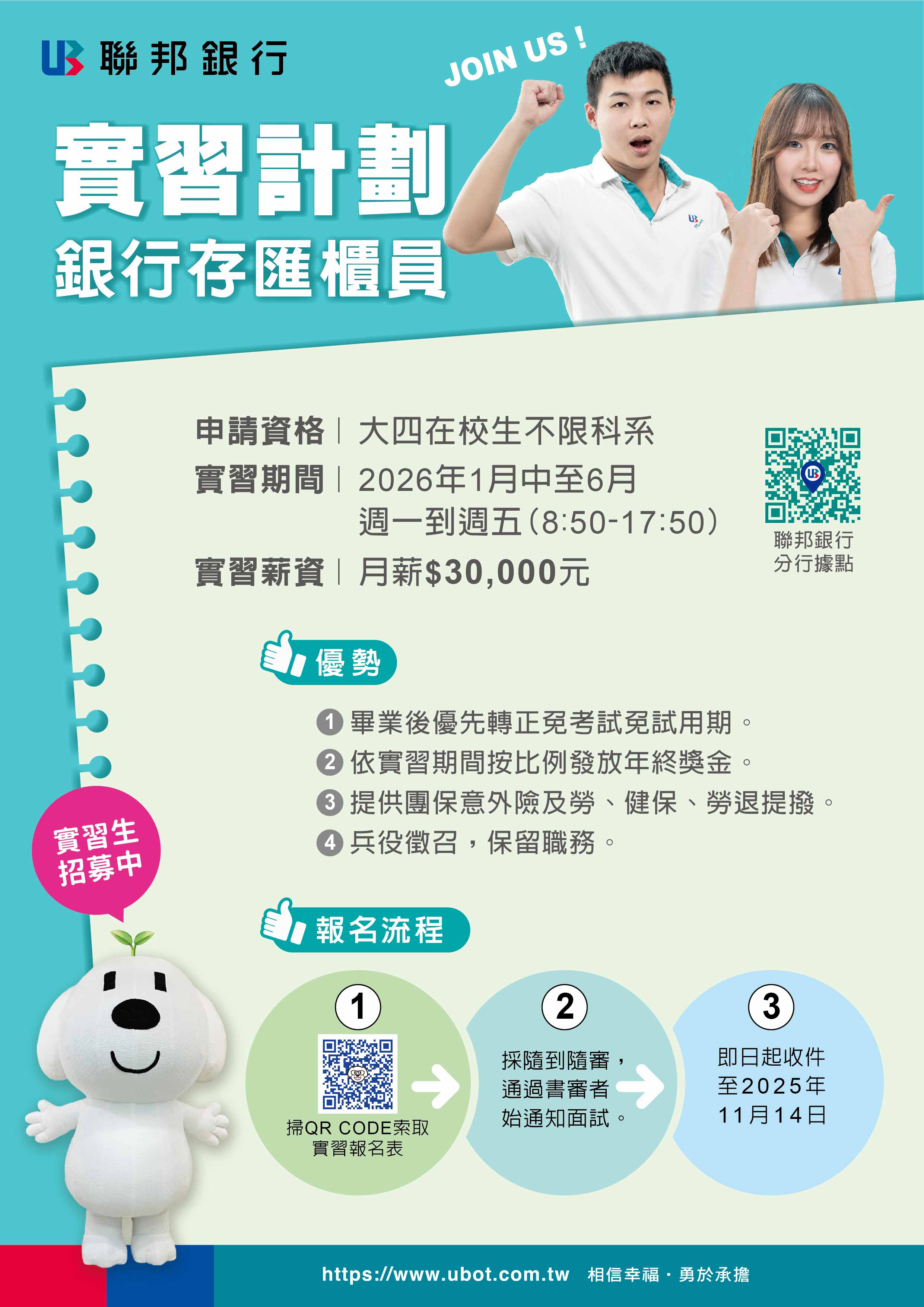 聯邦銀行2026年半年期的產學合作實習計畫正進行招募,相關內容可詳見附件。