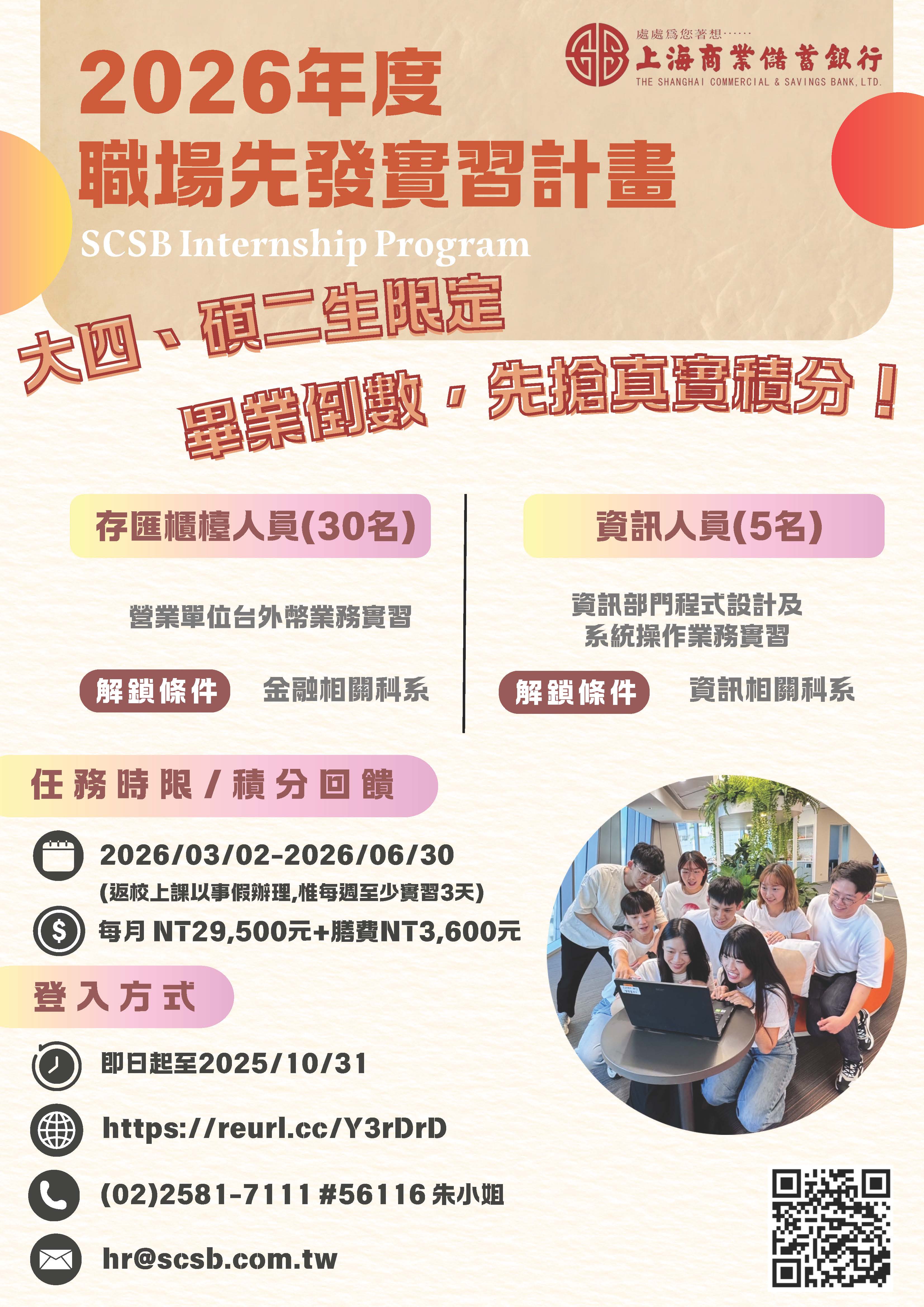 上海商業儲蓄銀行2026年半年期的職場體驗實習計畫現正進行招募,相關內容可詳見附件,此實習僅限合作系所學生申請。