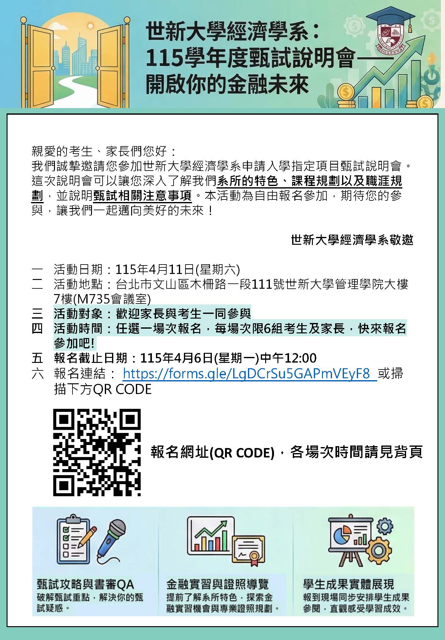 我們誠摯邀請您參加世新大學經濟學系申請入學指定項目甄試說明會。這次說明會可以讓您深入了解我們系所的特色、課程規劃以及職涯規劃,並說明甄試相關注意事項。本活動為自由報名參加,期待您的參與,讓我們一起邁向美好的未來!