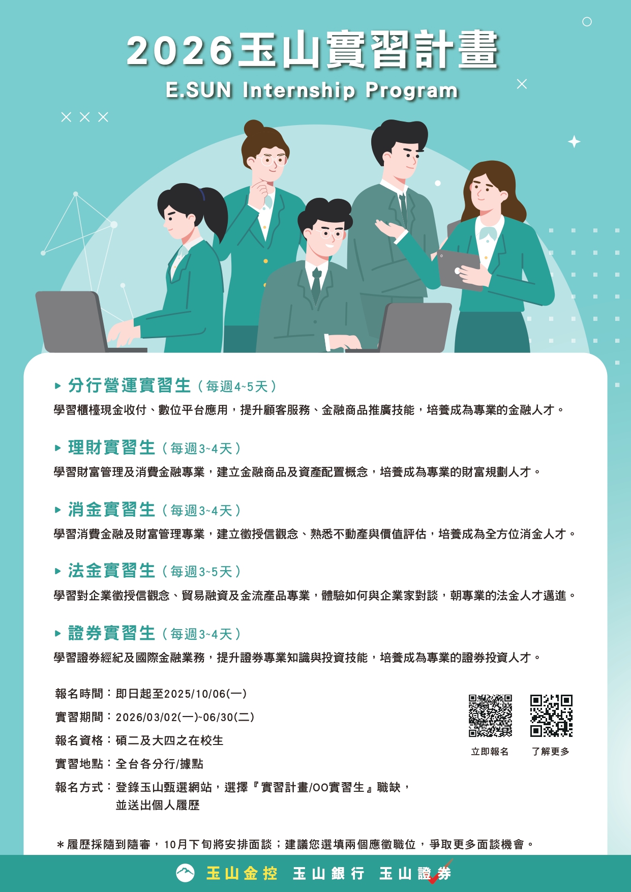 報名方式:請登入玉山甄選網站(https://recruit.esunbank.com.tw/Recruit/login),選擇「實習計畫/OO實習生」職缺,並送出個人履歷