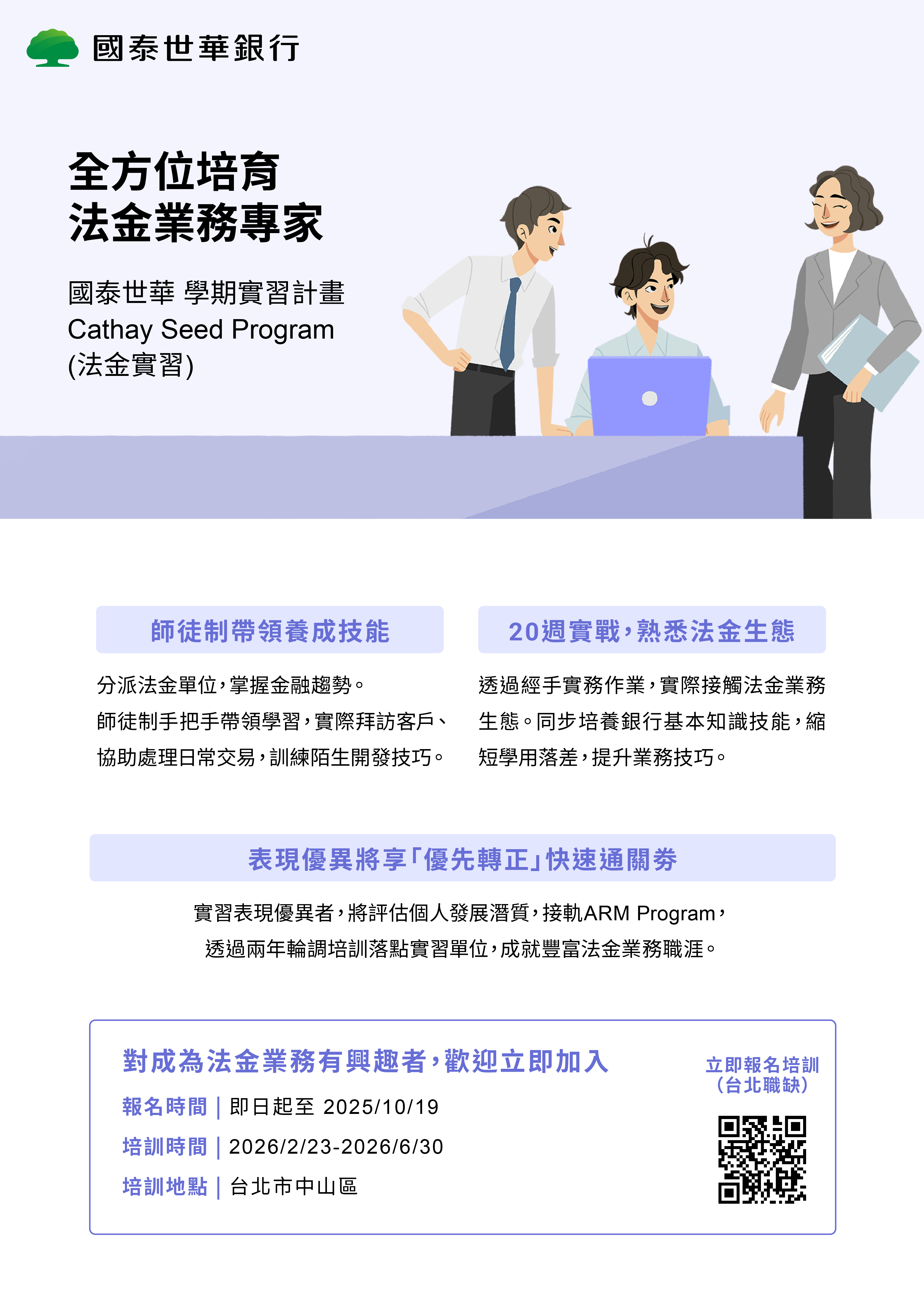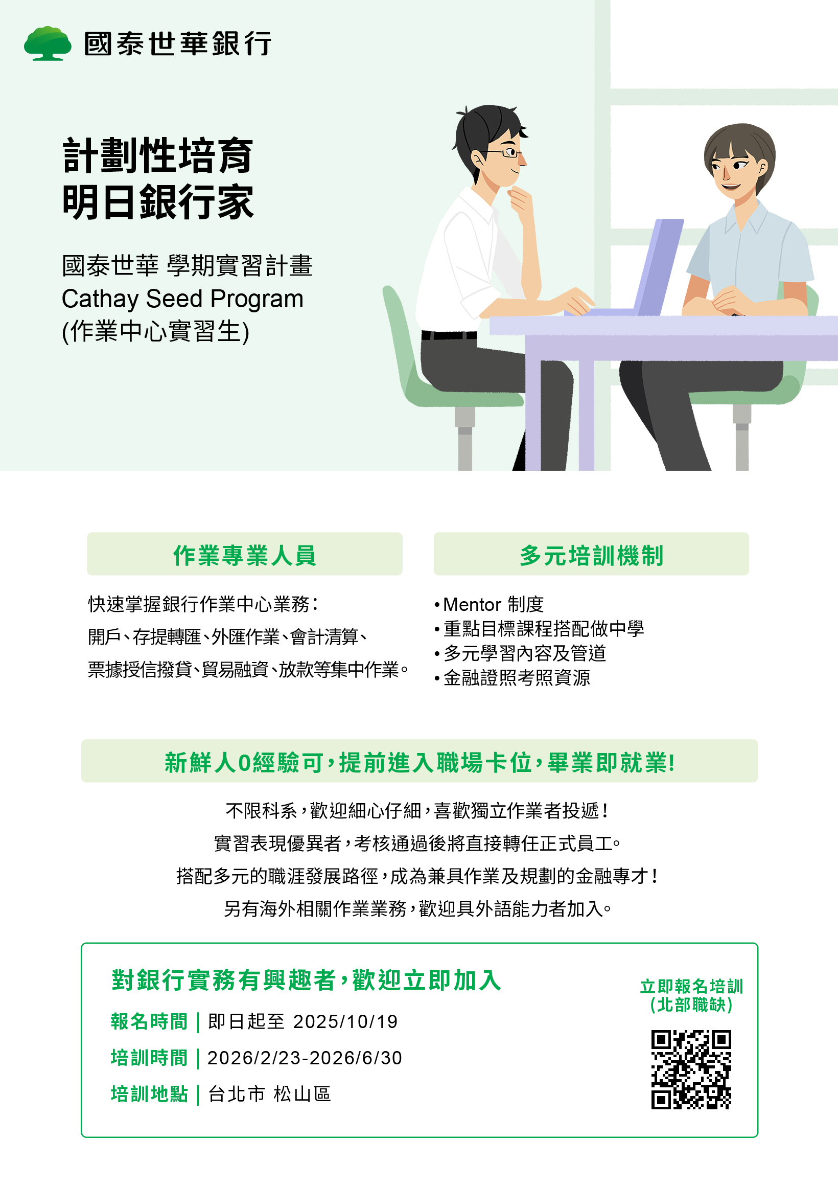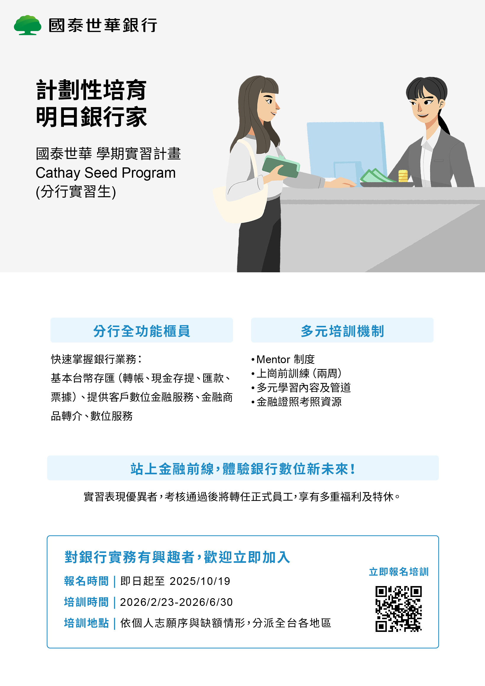 國泰世華銀行推出「Cathay Seed Program」學期實習計畫,提供多元化的實習職缺,協助大專院校學生提早認識金融業職場,培養專業技能與職涯競爭力。本計畫不限科系,0 經驗亦可申請,表現優異者更有機會直轉正職。