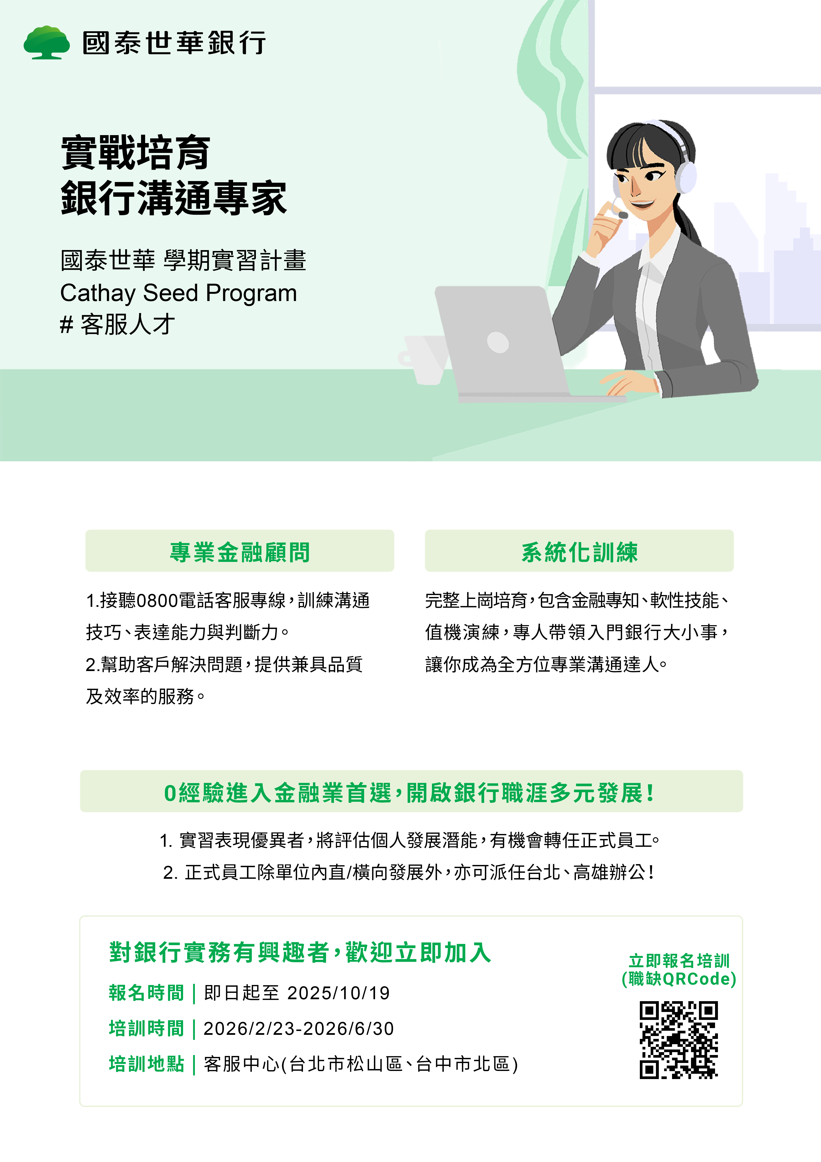 – 轉正機會:實習表現優異者,考核通過後可直接轉任國泰世華銀行正職員工。