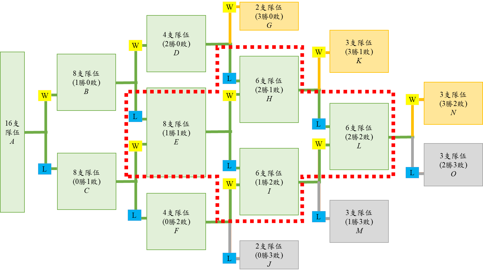 在電競賽事中,特別是大型國際賽(如英雄聯盟2024賽季世界大賽、西洋棋、棋藝類競賽等),多採用瑞士輪作為預賽階段的分組方式。如圖一所示,此賽制通常從16支隊伍開始,每隊都必須進行多輪比賽。在瑞士輪中,隊伍不會因單場失利而被淘汰,而是依照當前累積的勝敗紀錄重新配對。在第一輪,所有隊伍皆以隨機方式配對;自第二輪起,戰績相同的隊伍會被分到同一區塊,例如1勝0敗(B區)、0勝1敗(C區)等,並僅與相同戰績的對手對戰。每輪比賽後,各隊依照新戰績再次分組,形成如圖中的多條勝敗分支,例如2勝0敗(D區)、1勝1敗(E區)、2勝1敗(H區)、1勝2敗(I區)等。最終,達到特定勝場門檻(如三勝)的隊伍晉級決賽階段。