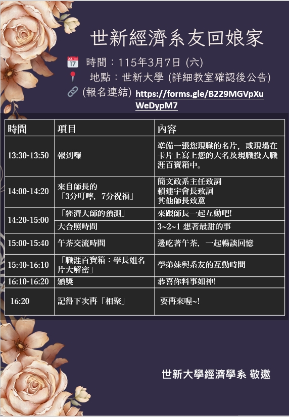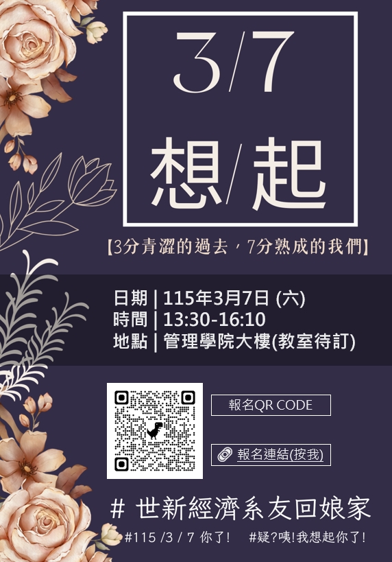 📣 3月7日,世新經濟系系友回娘家