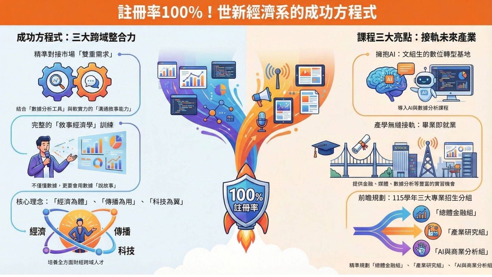面對 100% 註冊率的肯定,世新經濟系表示,這代表「跨域融合」的教育方針獲得了市場的高度認同。未來將持續深化「經濟為體、傳播為用、科技為翼」的教學模式,培育出更多具備全方位戰鬥力的財經跨界人才。